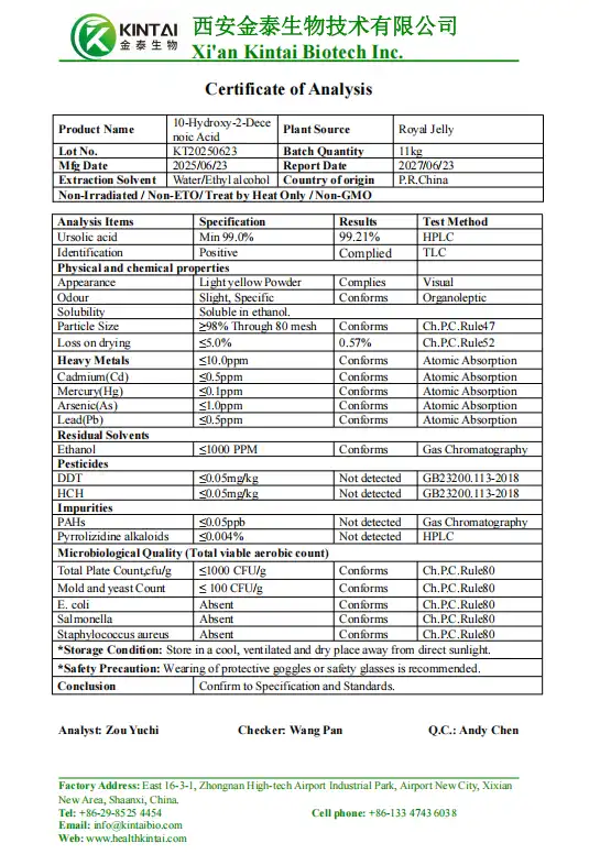 Dewiswch KINTAI fel eich un chi Powdr 10-HDA partner – lle mae ansawdd yn bodloni arloesedd. Mae ein hymrwymiad i ragoriaeth, ynghyd ag integreiddio di-dor o wasanaethau ymchwil, cynhyrchu ac addasu, yn ein gosod ar wahân yn y diwydiant. Cysylltwch â ni yn info@kintaibio.com i ddyrchafu eich profiad Asid Clorogenig.